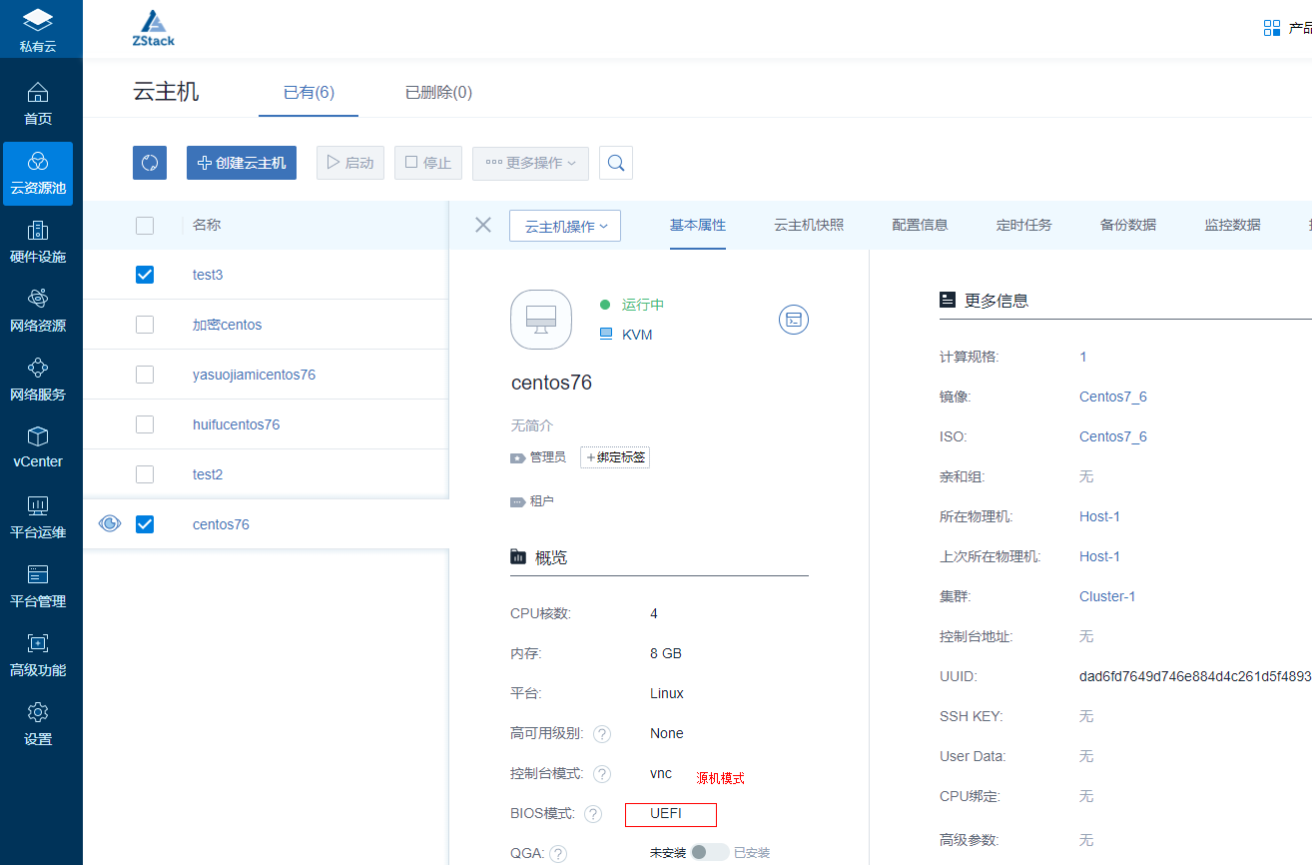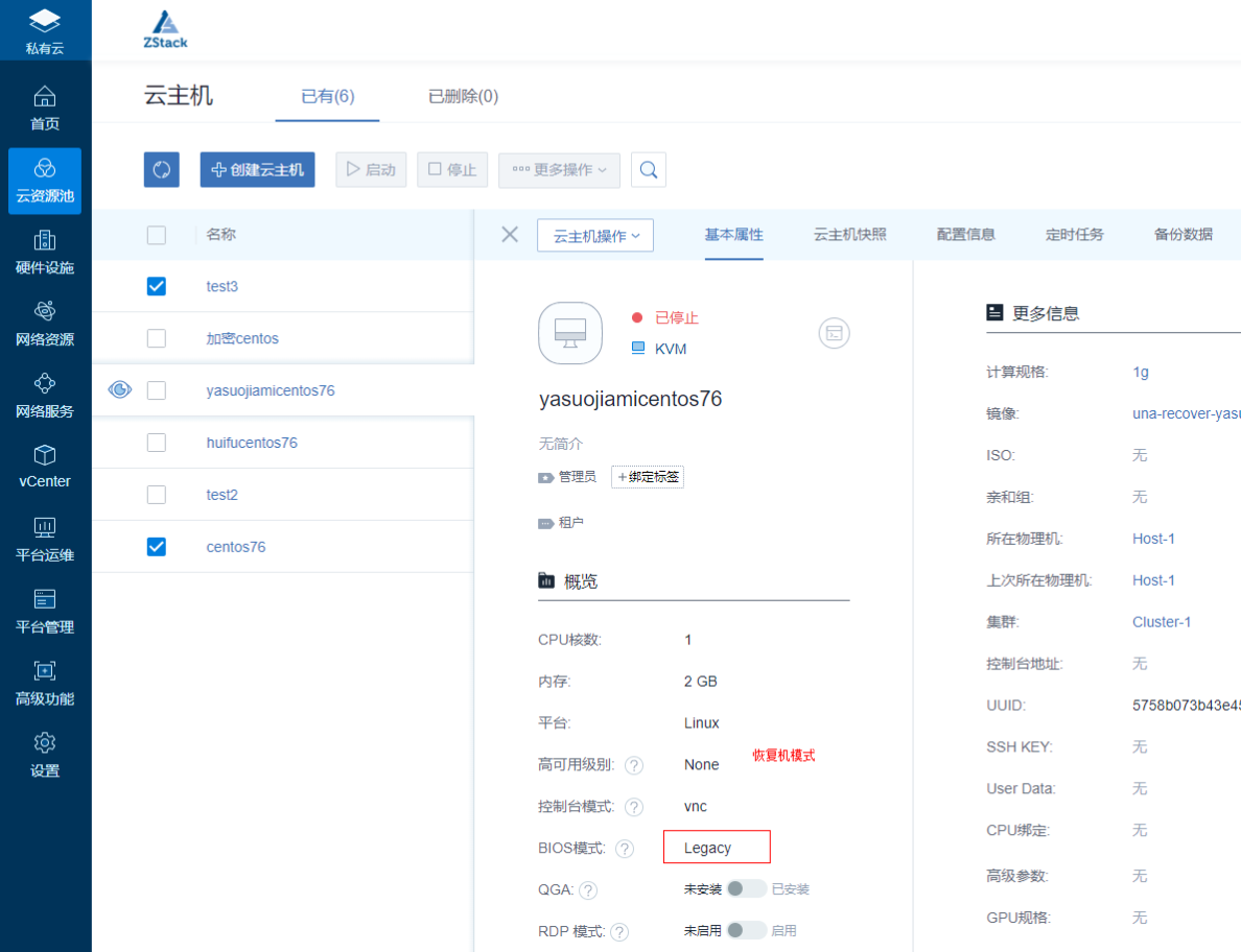 登錄到ZStack平臺(tái)的Web頁(yè)面,手動(dòng)修改恢復(fù)機(jī)的BIOS模式。