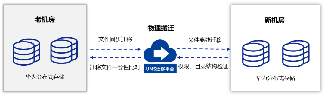 解決方案:考慮到源端機(jī)房和目標(biāo)端機(jī)房網(wǎng)絡(luò)不通,通過(guò)前期的詳細(xì)環(huán)境調(diào)研,制定符合用戶需求的離線遷移方案。采用航天壹進(jìn)制UMS文件遷移先將原華為對(duì)象存儲(chǔ)上300+TB文件在線遷移至UMS遷移平臺(tái),遷移后進(jìn)行文件比對(duì)確保數(shù)據(jù)一致性;物理搬遷后將UMS遷移平臺(tái)上的海量文件遷移至新機(jī)房對(duì)象存儲(chǔ)上,遷移后進(jìn)行文件權(quán)限、目錄等校驗(yàn),確保遷移數(shù)據(jù)可用。